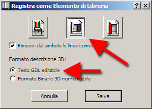 Dal Menu Archivio/Oggetti GDL, scegliamo il comando Salva Modello 3D come. Digitiamo un nome, scegliamo il formato Oggetto ArchiCAD (*gsm), e clicchiamo su Salva. Nella finestra successiva, stavolta scegliamo il formato oggetto e quindi registriamolo nella posizione desiderata (ma sempre nelle librerie attive!).