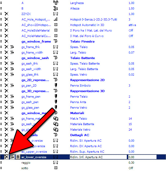 Scegliendo il sottotipo Finestra(Muro) ArchiCAD ha generato automaticamente una serie di variabili usate per gestire tutte le caratteristiche di un serramento (ereditate appunto dal sottotipo prescelto). Nel nostro caso non servirebbero a nulla, creerebbero solamente confusione nel dialogo dei settaggi della nostra finestra. Per renderle invisibili, basta che attivate l'icona a X sulla sinistra del nome della variabile. Attenzione, mi raccomando, NON cliccate a fianco delle variabili A e B, che gestiscono le dimensioni di ingombro della vostra finestra e, ovviamente, sulle due variabili appena create!
