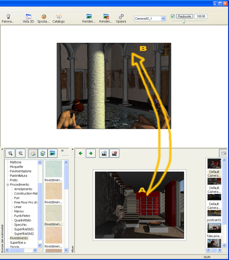 C Visualizzazione della cartolina corrente; da qui si può trascinare gli attributi dei materiali direttamente dalla cartolina agli elementi presenti nella finestra di anteprima.