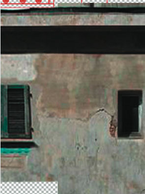 Innanzitutto ci conviene unire i due livelli (il livello 1 e il livello 2) in modo da poter lavorare agevolmente su entrambi contemporaneamente. Spengiamo, cliccando sull'occhio, il livello Sfondo e utilizziamo il comando "Unisci visibili" dal menu Livello di Photoshop. Photoshop ha un utilissimo strumento, il Timbro che ci permette di ritoccare in maniera ottimale le foto e, in questo caso, riempire la lacuna presente nell'intonaco. Selezioniamo quindi lo strumento Timbro e clicchiamo (con il tasto ALT premuto) sopra la parte di intonaco da copiare. Rilasciamo il tasto ALT e clicchiamo sulla lacuna di intonaco che vogliamo riempire. Se ce ne fosse bisogno possiamo diminuire l'Opacità in modo da "amalgamare" meglio la zona. Il risultato dovrebbe essere come quello che vediamo in figura.