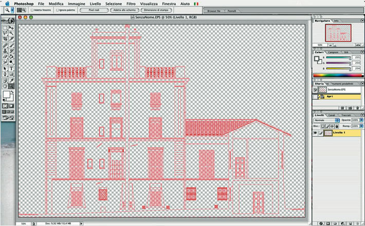 Apriamo adesso in Photoshop questo file appena salvato e avremo le linee rosse su sfondo trasparente e non trascuriamo un particolare importante: nel salvataggio in PDF il documento mantiene invariate le proprie dimensioni, quindi nel caso in esame viene mantenuta la scala 1:50 del prospetto disegnato in ArchiCAD.