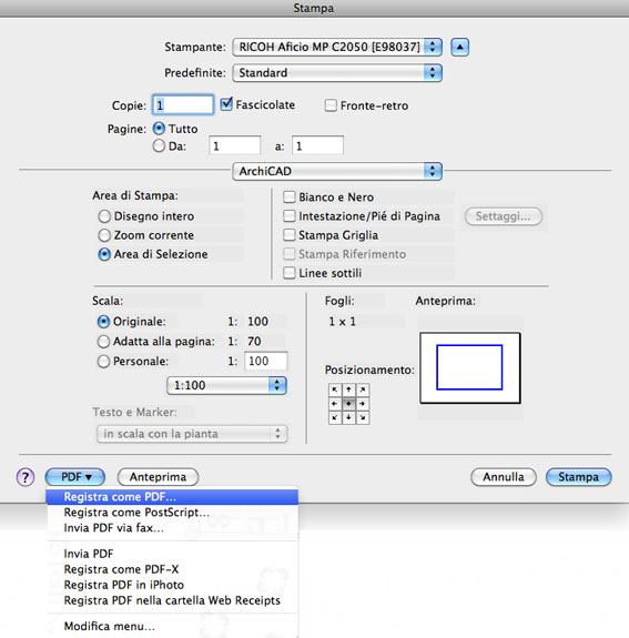 Purtroppo ArchiCAD non ha più come formato di esportazione l'EPS, ma niente paura, c'è il formato PDF ! Salviamo quindi il file di ArchiCAD in formato PDF.  Questo procedimento è possibile sia attraverso l'uso del Navigatore (pubblicazione) che attraverso il comando Stampa.  Di seguito la schermata di registrazione del documento PDF tramite il comando Stampa di ArchiCAD.