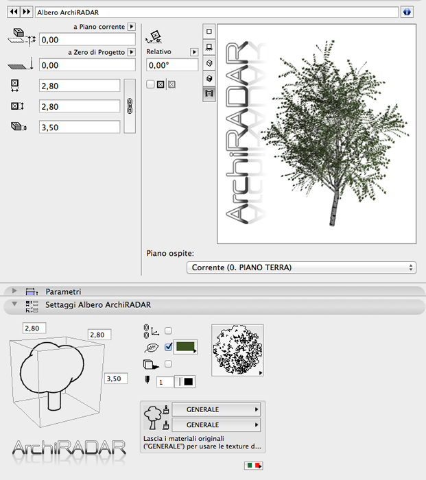 Si tratta di un oggetto albero betulla 3D, con possibilità di modifica di dimensioni e texture foglie (per stagione invernale, primaverile o autunnale) e personalizzazione simbolo 2D in pianta.
