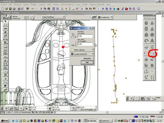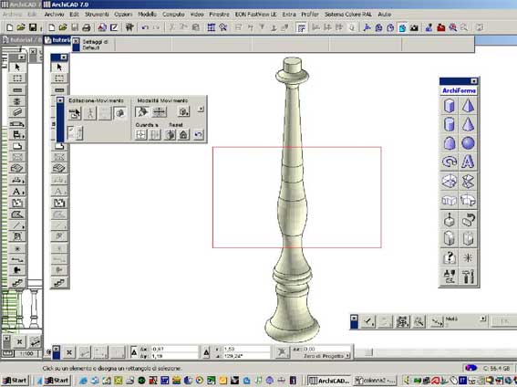 Cominceremo con il realizzare la colonna posta al centro della finestra, tracciamo l’asse della colonna ed  un profilo stando attenti ad usare solo i comandi linee ed archi, non usate gli strumenti spline, perché ArchiForma non supporta questo tipo di linea, una volta tracciato il profilo, selezioniamolo e raggruppiamolo, un consiglio salvate sempre una copia delle linee che tracciate, perché usando alcuni comandi di ArchiForma le linee di costruzione spariscono.