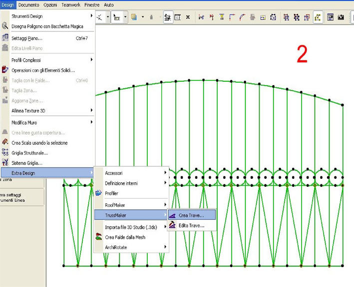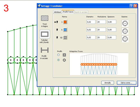 Dopo aver disegnato il prospetto del nostro cancello occorre selezionarlo, dopodichè andare nel menu Design/Extra Design/TrussMaker/Crea Trave in modo da far comparire la finestra di configurazione di TrussMaker.