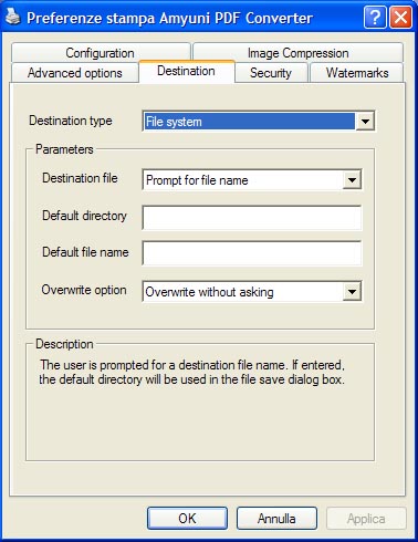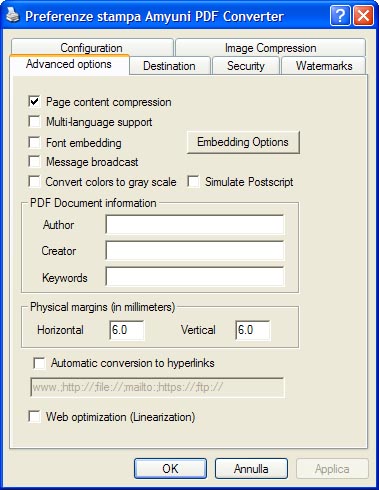 Vi consiglio di settare questi parametri come default, poi di caso in caso potrete modificarli a piacimento. Andiamo quindi in Start\Pannello di controllo\Stampanti e fax (scusatemi la lungaggine ma è universale per tutti i sistemi Windows 2000 e XP). Poi tasto destro su Amyuni PDF Converter e dal menu contestuale selezionare Preferenze stampa...
