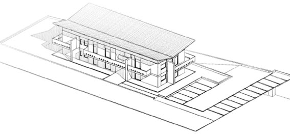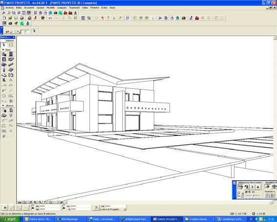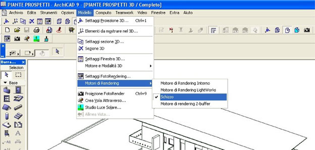Come esempio per questo tutorial ho preso un file di una palazzina su cui sto lavorando. Una volta aperto il file e decisa la vista che vogliamo ottenere con la tecnica a schizzo, in questo caso un assonometria, dal menu motori di rendering si sceglie quello a schizzo.