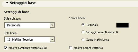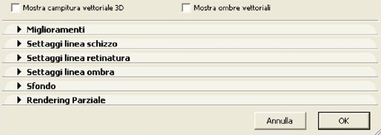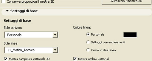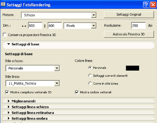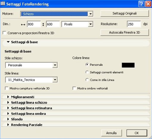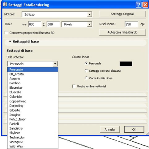 All'interno della finestra settaggi fotorendering troviamo una serie di finestre a tendina che servono a settare l'aspetto grafico del rendering a schizzo. La prima è la finestra settaggi di base, di cui si sono già visti gli stili e la funzione ombre vettoriali.