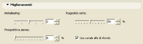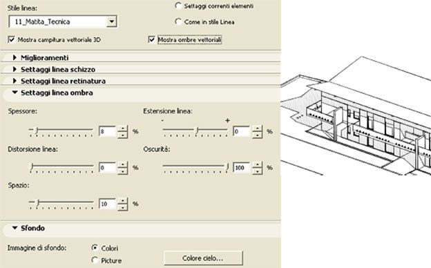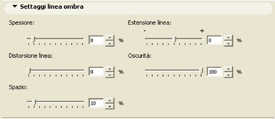 Nel pannello Settaggi Linea Ombra si determinano i parametri grafici dell'aspetto della linea. Variandoli si possono ottenere vari effetti come ad esempio il cambiamento dell'oscurità delle zone in ombra.