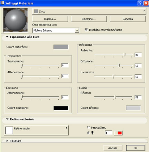 Una volta realizzato il retino torniamo nella finestra settaggi materiale ed assegniamo il retino corretto al materiale C01. Torniamo nella finestra dei settaggi motore rendering e verifichiamo che sia spuntata la voce "mostra campiture vettoriali".