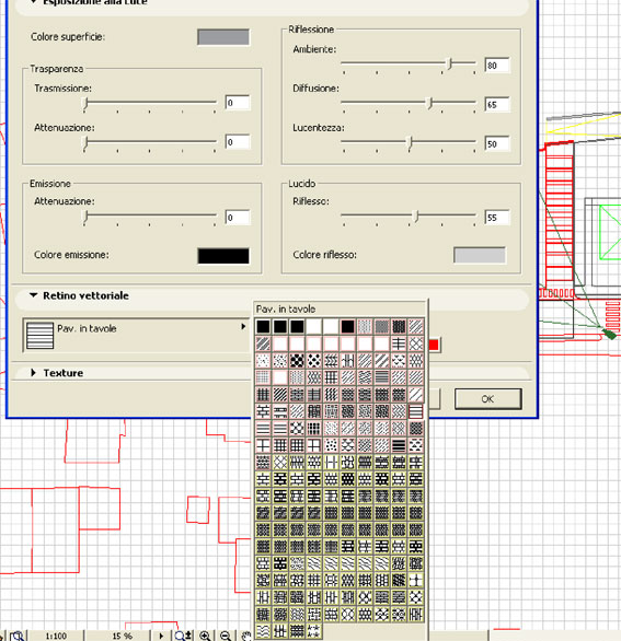 E' possibile visualizzare dei retini vettoriali nel rendering a schizzo. Il retino che si vuole visualizzare deve essere settato pima nella finestra di dialogo di impostazioni dei materiali, nella sezione retino vettoriale.
