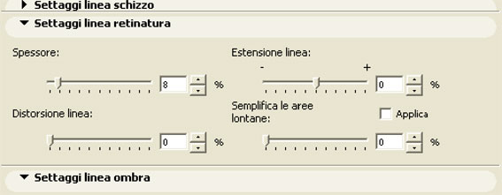 Le prime tre impostazioni hanno gli stessi effetti di quanto spiegato precedentemente ma agiscono solo sulle linee dei retini, la voce ha l'effetto di semplificare la linea dei retini più lontani per evitare un risultato pari ad una macchia nera per retini molto complessi.