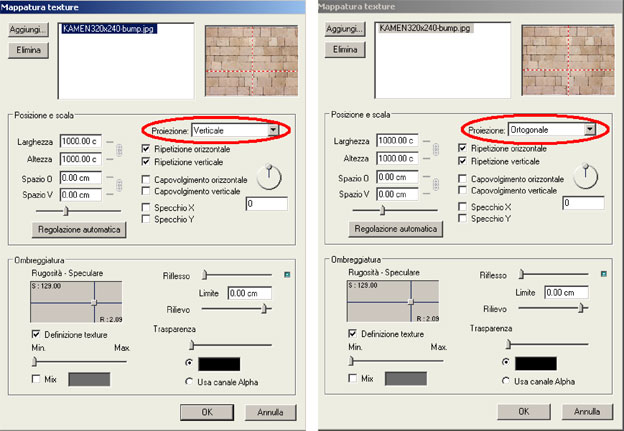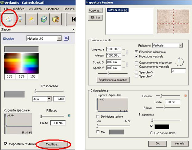 Clicco sull'icona della barra "Prepara documento" che mi apre la finestra di dialogo con gli "Shaders" e quindi clicco sul tasto "Modifica" facendo apparire la finestra di dialogo "Mappatura texture".