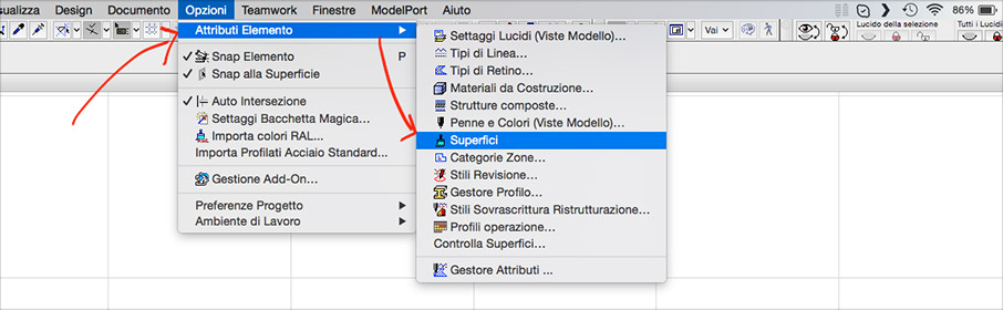 Tramite il percorso di menu “Opzioni/Attributi Elemento/Superfici” accedere alla finestra “Settaggi Superficie”