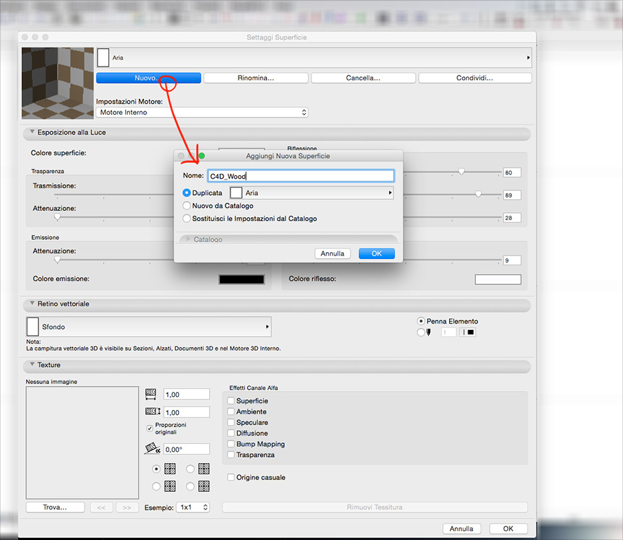 • Nella finestra “Aggiungi Nuova Superficie” selezionare la voce “Duplica” e digitare il nuovo nome del materiale.