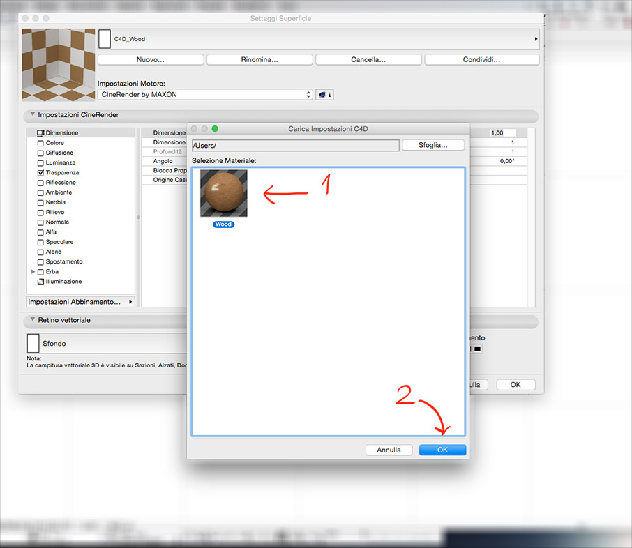 Dalla finestra “Carica Impostazioni C4D” selezionare il materiale desiderato (1) e successivamente cliccare sul pulsante “OK” (2)