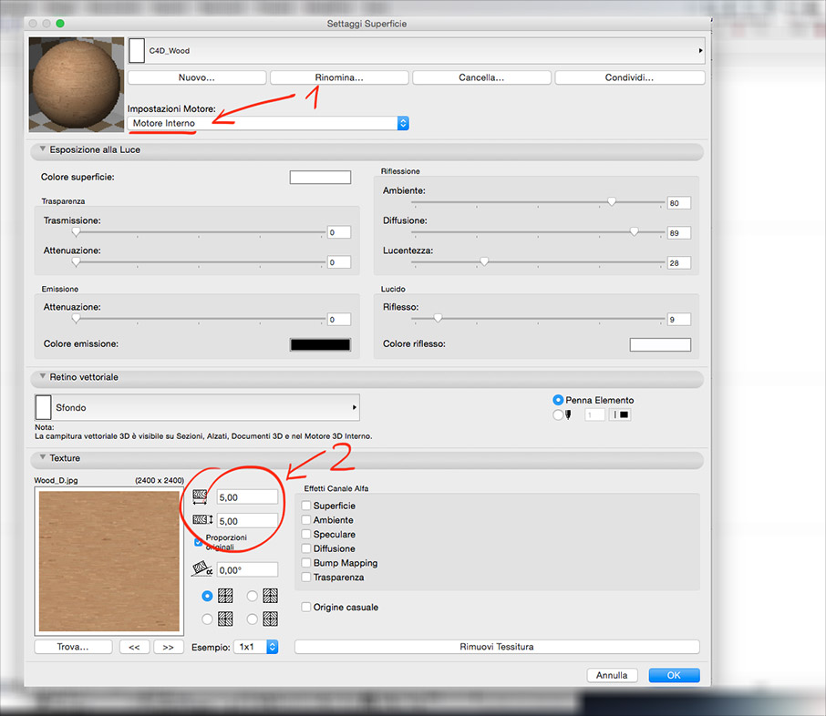 Rimanendo in modalità “Motore Interno” (1) impostare le dimensioni che la texture deve avere nel progetto (2). In questo caso supponiamo che la texture del legno copra una superficie di 5 x 5 metri.