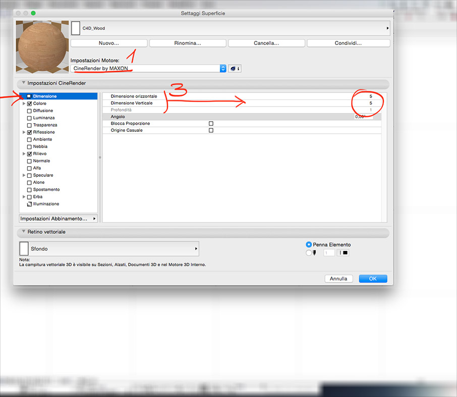 • Selezionare la voce “Dimensione” nelle impostazioni di CineRender (2)