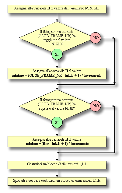 Se la condizione è realizzata, cioè l'animazione è giunta al fotogramma "inizio", modifica il valore della variabile H, assegnandole il risultato della formula. La parte fra parentesi (GLOB_FRAME_NR - inizio +1) restituisce il numero 1 al fotogramma "inizio", 2 al fotogramma seguente, 3 al successivo ecc. Infatti, sapendo che "inizio", nel nostro esempio, è impostato a 10, avremo che al decimo fotogramma la formula vale (10 - 10 + 1) = 1; all'undicesimo sarà (11 - 10 + 1) = 2; al dodicesimo (12 - 10 + 1) = 3 ... Questo ci permette di calcolare la nuova altezza da assegnare, pari al valore iniziale (variabile "inizio") + il numero ottenuto, moltiplicato per il valore di "incremento". (Ricordiamo che nel GDL, come in quasi tutti i linguaggi di programmazione, la moltiplicazione è indicata con l'asterisco).