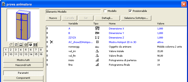 Le operazioni da compiere nel corso dell'animazione possono essere le più disparate. Nel nostro esempio abbiamo modificato semplicemente un'altezza, ma la gamma di istruzioni utilizzabili è virtualmente infinita, e limitata solo dalla fantasia. C'è chi ha realizzato superfici con onde mobili, per simulare un mare agitato, chi ha fatto delle bandiere che garriscono al vento... un altro esempio potrebbero essere quello di un semaforo funzionante, con le luci che si alternano a tempo, o un'insegna con una scritta scorrevole, come quella che potete scaricare in fondo a questa pagina (vers. AC8). Per terminare vediamo rapidamente come aggiungere il movimento ad un oggetto di libreria esistente senza modificarlo! Basta creare un nuovo oggetto che chiama quello da animare, inserendo le istruzioni necessarie. Prendiamo per esempio il "Mobile colonna 2 ante" da 1. Libreria di base/1.1 Arredi/Mobili Cucina. Voglio animare l'apertura delle ante, quindi la prima cosa da fare è aprire l'oggetto, per vedere il nome della variabile da "pilotare". Scorrendo l'elenco dei parametri si vede che la variabile che controlla l'apertura delle ante si chiama "door_ang".