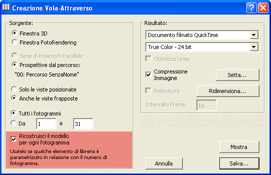 Può essere utile anche definire il percorso come "poligonale", nel caso che vogliate fare un'animazione con due o più telecamere perfettamente sovrapposte, per avere solo il movimento degli oggetti, mantenendo ferma l'inquadratura. L'ultima accortezza, ASSOLUTAMENTE NECESSARIA, è quella di attivare l'opzione "Ricostruisci il modello per ogni fotogramma". Questo ovviamente allunga i tempi di calcolo ma, diversamente, ArchiCAD crea il modello solo per il primo fotogramma, e lo utilizza poi per tutta l'animazione, senza modificare l'aspetto dei singoli elementi.